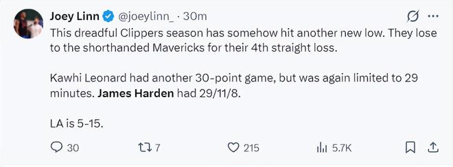 赛后快船记者Joey Linn写道:这支糟糕的快船队似乎又刷新了他们的下限,他们居然输给了阵容不整的独行侠,已经吞下一波四连败。莱昂纳德虽然发挥出色拿到30分,可他的登场时间被控制在30分钟以内,哈登则拿到29分11篮板8助攻。