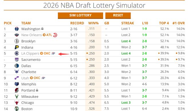 快船最惨烈的地方在哪里?最惨烈的地方在于2026年的首轮签还不在自己手中,快船已经跌至西部倒数第二,目前5胜15负,他们前四签的概率已经高达39.9%,状元签概率都有9.8%,雷霆队有希望笑纳一个前五顺位的超级新星。